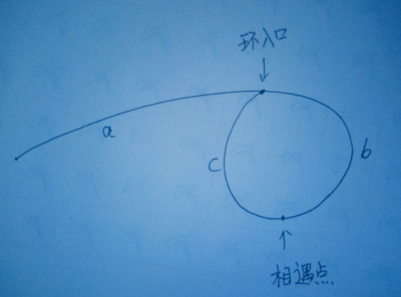 慢指针路程=a+b,这里要证明慢指针被追上时一定没有走完一圈,否则慢指针路程就是a+(b+c)m+b。慢指针进圈的时候,和快指针的最大距离是b+c-1,如果在这个距离下,慢指针被追上时都没有走完一圈,那么任何情况下就一定不会。假设从慢指针进圈到被追上经过t秒,它的速度是1,快指针速度是2,那么2t=t+(b+c-1),则t=b+c-1,慢指针走的路没有超过一圈,得证。