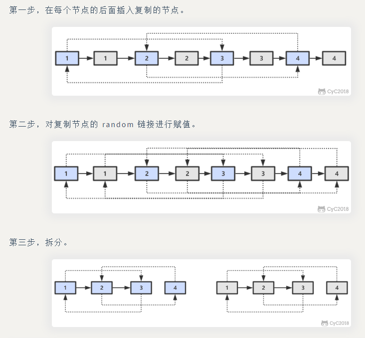 public class Solution { public RandomListNode Clone(RandomListNode pHead) { if(pHead == null) return null; RandomListNode cur = pHead; // 复制节点 while(cur != null){ RandomListNode clone = new RandomListNode(cur.label); clone.next = cur.next; cur.next = clone; cur = clone.next; // 因为cur、pHead都是引用,指向同一个链表,到这步节点已经复制并保存在pHead指向的链表中, } // 所以cur = clone.next 不会覆盖已经复制的链表,只是cur指向了别的地方,如果还不理解,去看java内存分析 // 设置随机指针 cur = pHead; while(cur != null){ cur.next.random = (cur.random != null)?cur.random.next:null; //这里要判断cur.random是否为空,否则会报空指针异常 cur = cur.next.next; } // 分离 cur = pHead; RandomListNode dupHead = cur.next; while(cur.next!= null){ RandomListNode next = cur.next; cur.next = next.next; cur = next; } return dupHead; } }