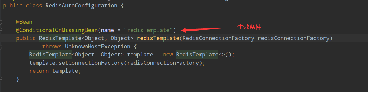 为什么注入spring容器之后就可以替换掉原来的RedisTemplate呢,因为在RedisAutoConfiguration中规定了如果容器中没有RedisTemplate类,默认的RedisTemplate才生效