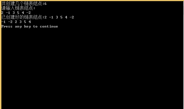 1 #include <stdio.h> 2 #include <stdlib.h> 3 typedef struct LNode{ 4 int data; 5 struct LNode *next; 6 }LNode; 7 LNode* creat(int n){ 8 LNode *Link; 9 LNode *p1,*p2; 10 int data; 11 Link=(LNode*)malloc(sizeof(LNode)); 12 p2=Link; 13 for(int i=0;i<n;++i){ //一共n个数 14 scanf("%d",&data); 15 p1=(LNode*)malloc(sizeof(LNode)); 16 p1->data=data; 17 p2->next=p1; 18 p2=p1; 19 } 20 p2->next=NULL; 21 return Link; 22 } 23 24 LNode* separate(LNode *&A){ 25 LNode *p1,*p2; //指针p2是原始混合数链表的哨兵指针,把p2扫描到的负整数存到p1结点 26 LNode *p; //p后连接p1结点 27 LNode *q1,*q2; //把p2扫描到的正整数存到q1结点,已经存完负整数的p后再连接一个个q1结点 28 p=(LNode*)malloc(sizeof(LNode)); 29 p2=A->next; 30 q2=A->next;//q2再重新扫描原始链表 31 while(p2!=NULL){ 32 if(p2->data<0){ 33 p1=(LNode*)malloc(sizeof(LNode)); 34 p1->data=p2->data; 35 p->next=p1; 36 p=p1; 37 p2=p2->next; //p2继续向后扫描 38 printf("%d",p->data); 39 printf(" "); 40 } 41 else 42 p2=p2->next; 43 } 44 while(q2!=NULL){ 45 if(q2->data>0){ 46 q1=(LNode*)malloc(sizeof(LNode)); 47 q1->data=q2->data; 48 p->next=q1; 49 p=q1; 50 q2=q2->next; 51 printf("%d",p->data); 52 printf(" "); 53 } 54 else 55 q2=q2->next; 56 } 57 printf("\n"); 58 return A; 59 } 60 void print(LNode *Link){ 61 LNode *p; 62 p=Link->next; 63 while(p!=NULL){ 64 printf("%d",p->data); 65 printf(" "); 66 p=p->next; 67 } 68 printf("\n"); 69 } 70 71 int main(){ 72 LNode *Link=NULL; 73 int num; 74 printf("共创建几个链表结点:"); 75 scanf("%d",&num); 76 printf("请输入链表结点:\n"); 77 Link=creat(num); 78 printf("已创建好的链表结点:"); 79 print(Link); 80 separate(Link); 81 return 0; 82 }