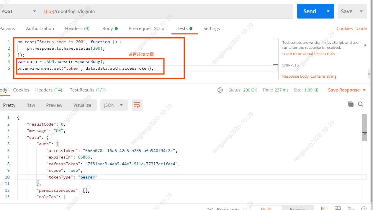 二、在该接口Tests中编写脚本,找到token,并设置为环境变量;
