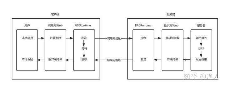 常规的RPC一般都是基于一个大的内部服务,进行分布式拆分,由于其语义上以本地方法的作为入口,那么天然的就更倾向于具备高性能、支持复杂参数和返回值、跨语言等特性。下图是RPC调用的过程示意图: