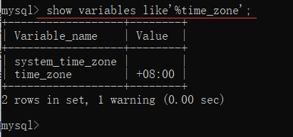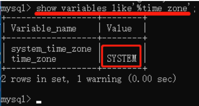 show variables like'%time_zone';(注意不要漏掉后面的分号),回车,如图: