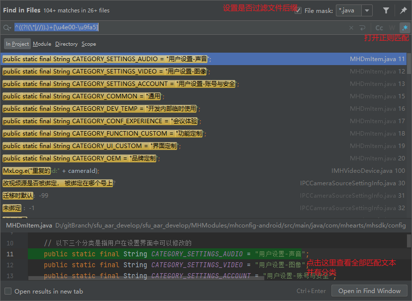2.利用Android studio全局搜索,ctrl+shift+f,勾选正则表达,然后根据实际情况是否过滤文件类型,最后点击右下角的 Open in Find Window查看详情(这里会帮你做好分类,进一步减少我们的工作量)