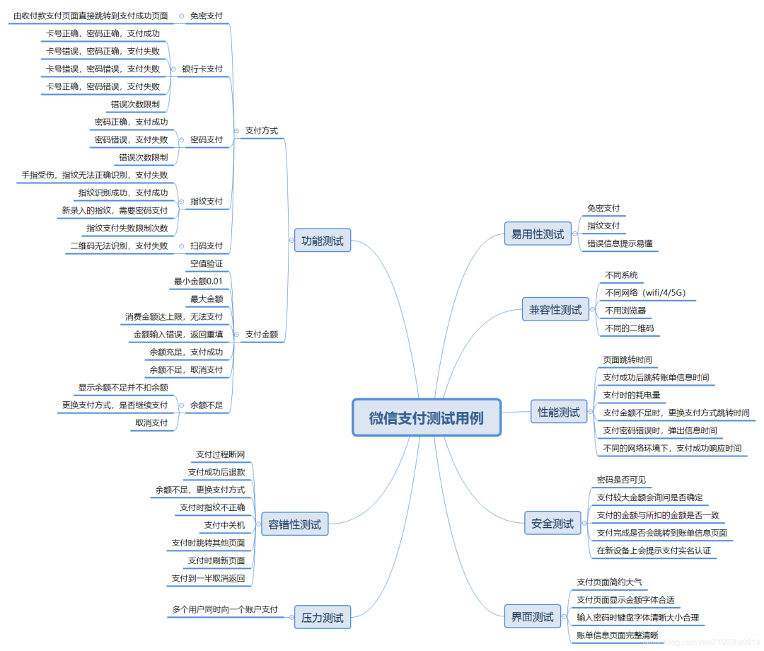 基于上面的测试思路,我们可以分析得出“支付功能”测试点如下: