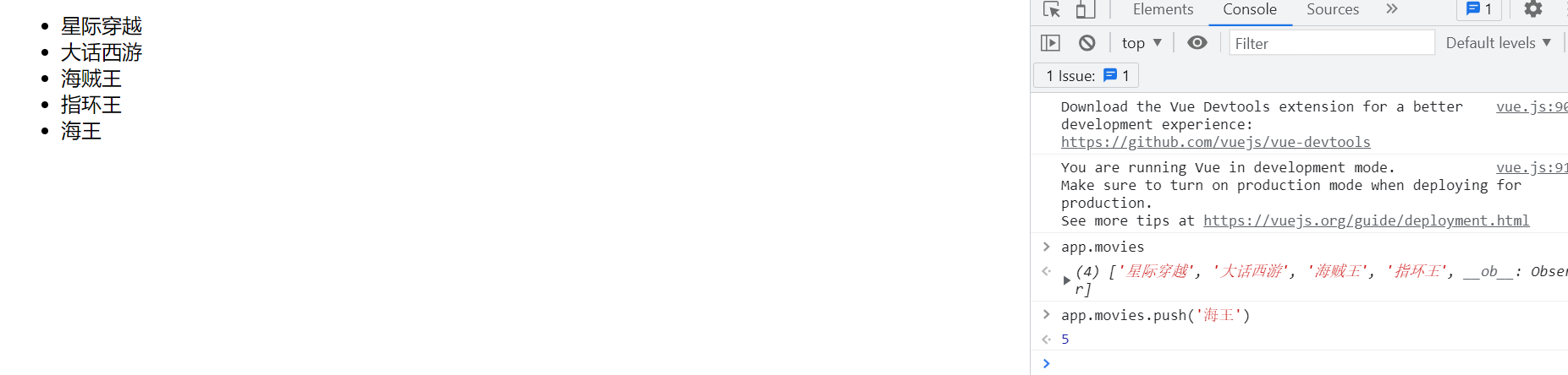 <!DOCTYPE html> <html lang="en"> <head> <meta charset="UTF-8"> <meta http-equiv="X-UA-Compatible" content="IE=edge"> <meta name="viewport" content="width=device-width, initial-scale=1.0"> <title>02-vue列表</title> <script src="../js/vue.js"></script> </head> <body> <!-- //开始写显示在网页中的东西 --> <div id="app"> <ul> <li v-for="item in movies">{{item}}</li> <!-- 表示遍历整个数组按照列表的形式来进行展示 --> <!-- v-for:表示遍历数组中的每一项来进行展示 --> </ul> </div> <script> const app =new Vue({ el:'#app', data:{ message:'你好啊', movies:['星际穿越','大话西游','海贼王','指环王'] //表示建立一个数组来使用列表的实行来进行展示 } }) </script> </body> </html>