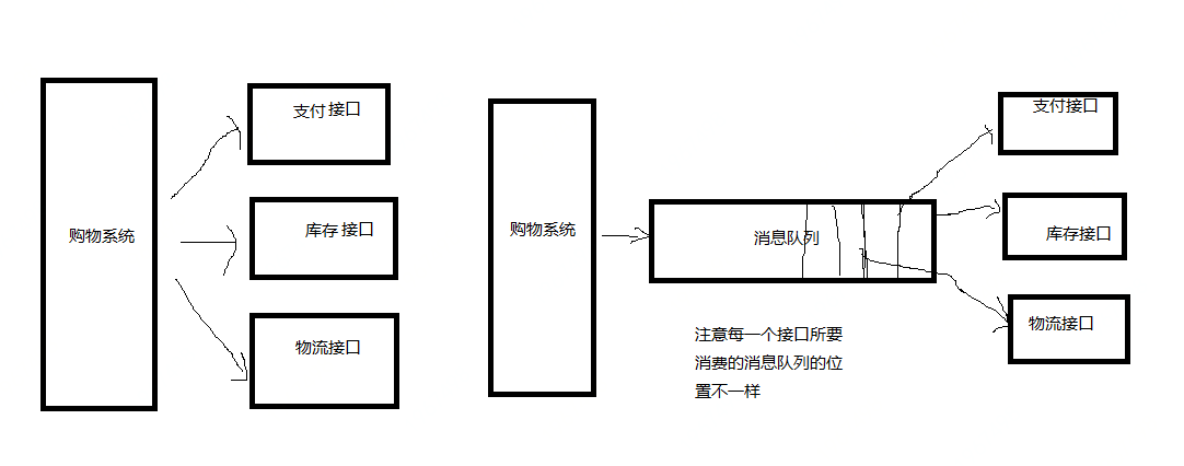 比如电商购物功能,购物的功能包括检查库存,调用物流接口,调用支付接口等,如果下单操作中的任何一个接口出现问题,则用户下单不会成功,因为是同一个事物,此刻用户就会感觉到系统异常。而如果用消息队列的方式呢,比如物流接口出现异常,只是把物流接口的请求消息放到消息队列等待物流接口好使之后再返回物流方面的数据,其他的接口还可以正常操作,不会使用户有感知,很大的提高了系统的稳定性。