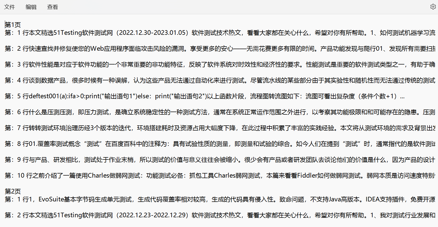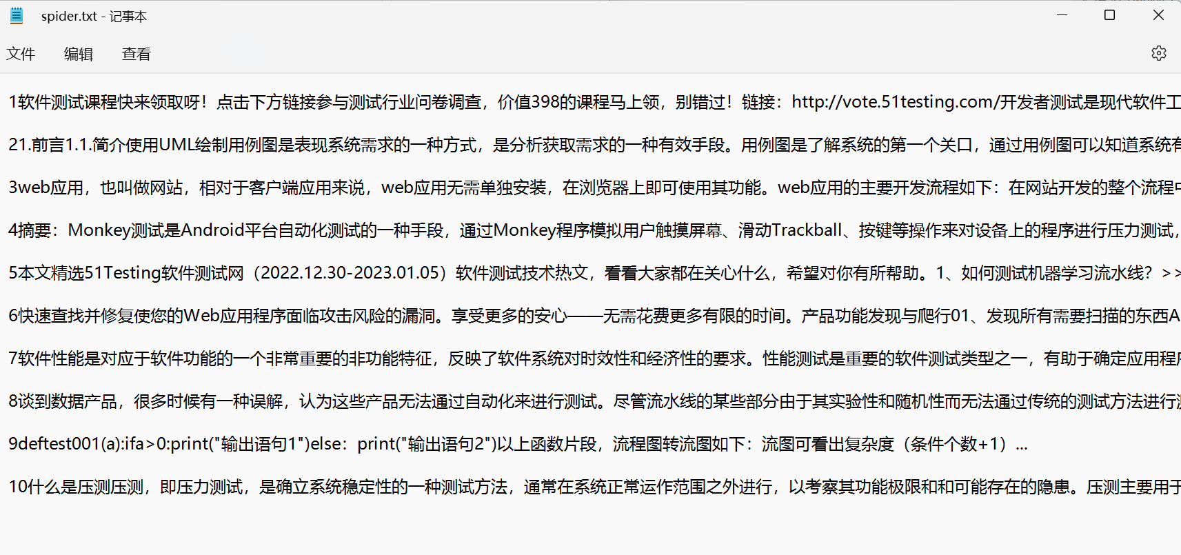 # 新建文件 file = open('data.txt','w') for j in range(2,5): print(j - 1) file.write(r'第{}页'.format(j-1)+'\n') # 提取数据 for i in range(1,11): ele = doc.xpath('/html/body/div[2]/div[3]/div[2]/div['+str(i)+']/div/p/text()')[0] print("第:{} 行--{}".format(i, ele)) # ele里面存在不可识别的字符,防止写入文件时报错,需要进行处理 new_ele = ''.join(ele.split()) file.write(r"第:{} 行{}".format(i, new_ele)+'\n'+'\n') # 获取第二页 url = 'http://www.51testing.com/html/90/category-catid-90-page-'+str(j)+'.html' rsp = requests.get(url) cod = rsp.apparent_encoding rsp.encoding = 'gbk' content = rsp.text doc = etree.HTML(content)