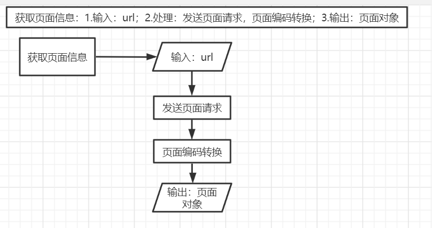 - 获取页面信息:1.输入:url;2.处理:发送页面请求,页面编码转换;3.输出:页面对象