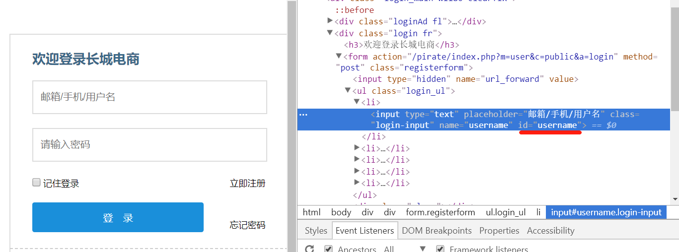 # 输入账号密码 # *********************【第一种元素定位方法:id】********************* shop_wdr.find_element_by_id('username').send_keys('cs001') shop_wdr.find_element_by_id('password').send_keys('123456')