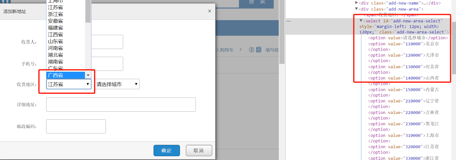 # 下拉选项框1-省 # 通过id找到省,但这是普通网页元素,click和send_keys都选不到下拉框里的值 sheng = shop_wdr.find_element_by_id('add-new-area-select') # 导入(from selenium.webdriver.support.select import Select)把省这个普通网页元素,强制转换成下拉框元素 # 下拉框元素里,通过可见的文本选择方法,选择对应选项 Select(sheng).select_by_visible_text('江苏省')