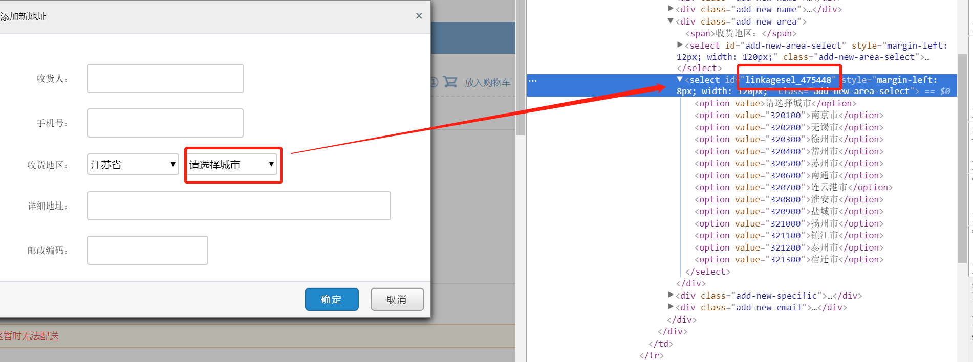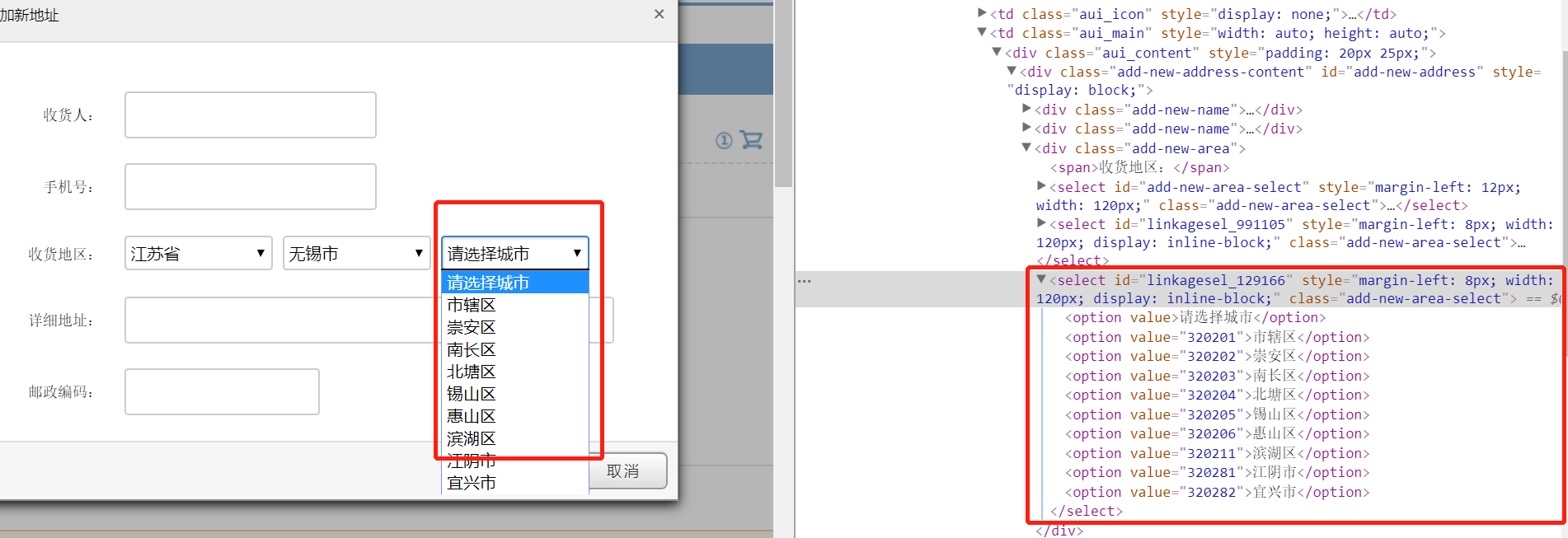 # 下拉选项框2-市 '''id="linkagesel_475448后面的数值会变动,class_name的值和下拉框1的值一样, 此时用find_elements(找到所有add-new-area-select后通过[1]取第二个元素)''' shi = shop_wdr.find_elements_by_class_name('add-new-area-select')[1] # 把shi强制转换成下拉框元素 Select(shi).select_by_visible_text('无锡市')