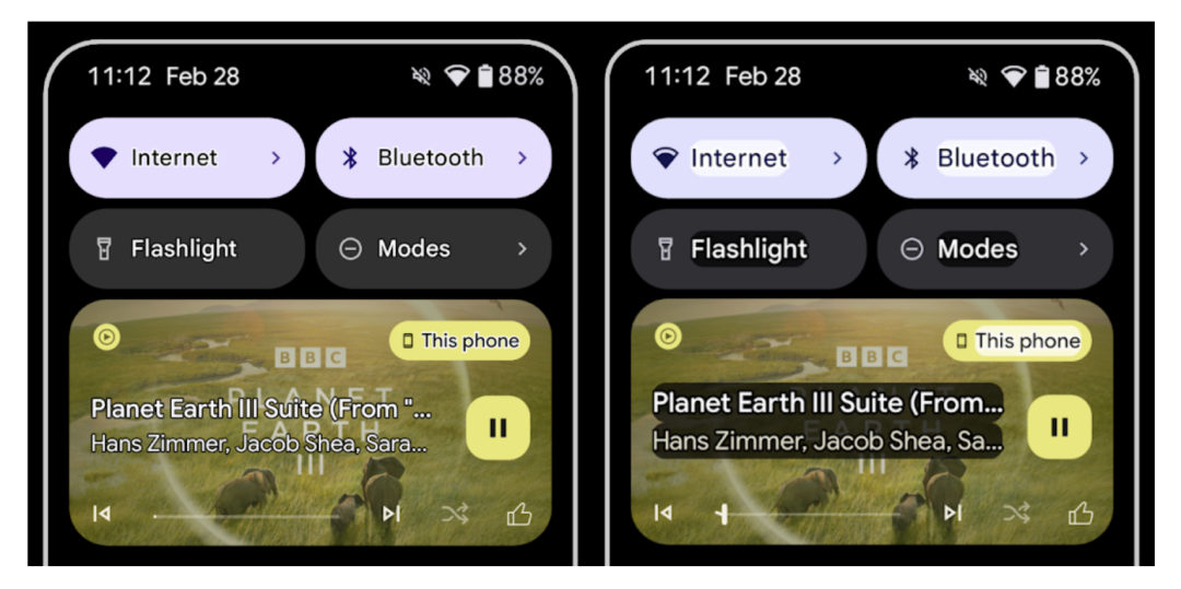 Android 16 新的轮廓文本无障碍功能应用前后,文本对比度增强的效果对比