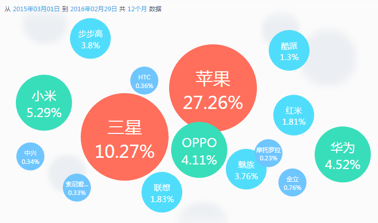 市面上目前存在的移动设备五花八门,下图列出过去12个月的移动设备品牌占比情况。
