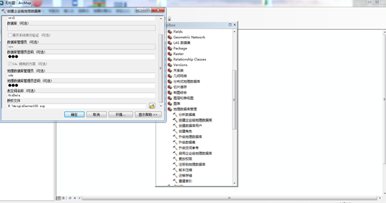 2、打开arcmap10.2程序,在ArcToolBox工具中创建企业级地理数据库,如图: