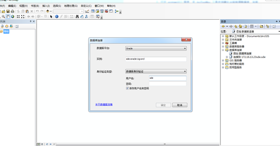 3、在arcmap程序中,点击目录》数据库连接》添加数据库连接,弹出数据库连接页面,如图,注意,此窗口中的用户名和密码为步骤2中创建的sde账号以及密码: