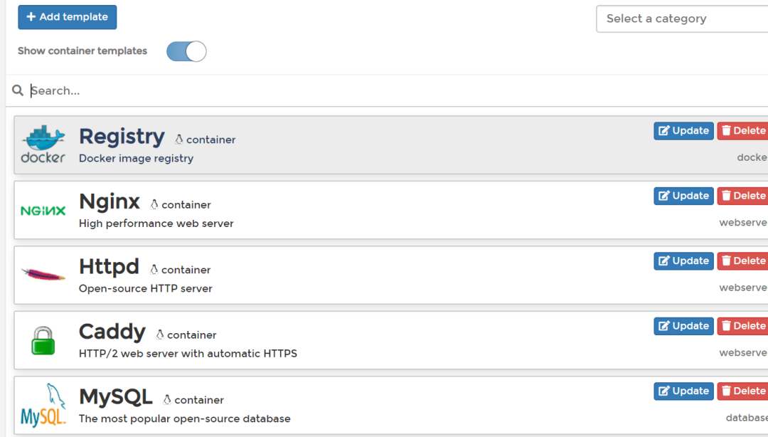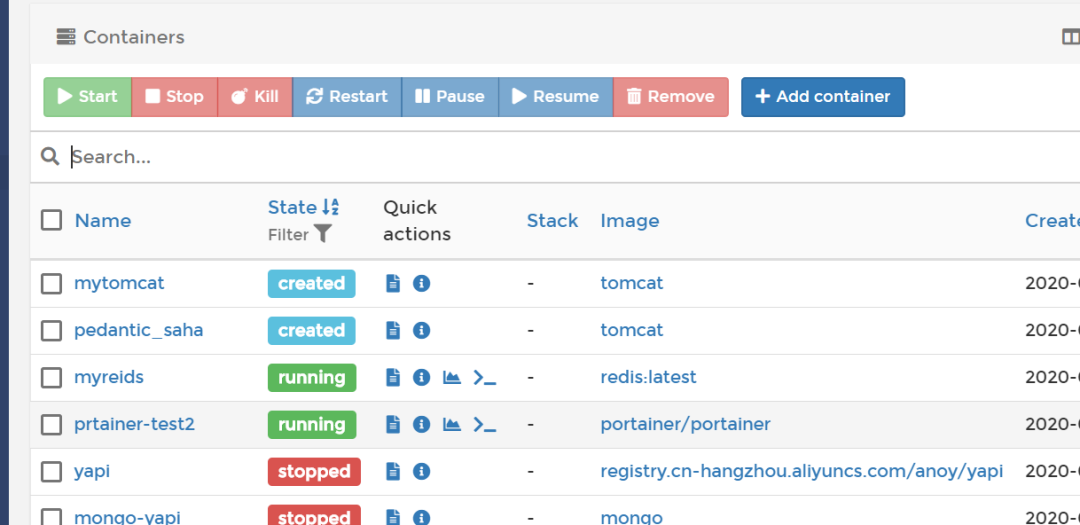 包括点击进入后对容器的监控 Portainer 还提供了各种镜像的管理,可以根据他提供模板快速搭建想要的容器