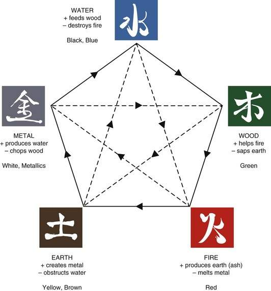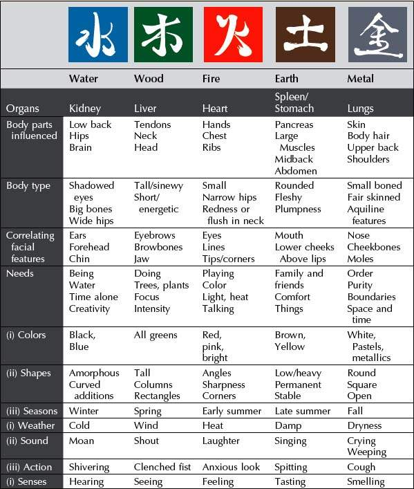 尽管这些元素在自然界中容易达到平衡,但在我们的生活中平衡它们却是一门艺术。这五种元素在我们的身体中也以五种主要器官及其相关的身体部位、情感和行为形式存在。每个人都拥有这五种主要器官:与水相关的肾脏;与木相关的肝脏;与火相关的心脏;与土相关的脾胃;以及与金相关的肺。这些是至关重要的器官,因为如果其中任何一个器官出现故障,没有医疗干预就可能导致死亡。由于每个人都拥有这五大器官,我们每个人都拥有这五大元素作为我们的一部分。这五大元素的个体平衡取决于每个器官的功能、先天倾向及其强弱,以及过度使用或使用不足。