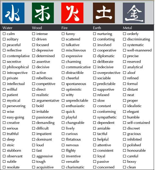 古代中国人运用五行系统将世界划分为振动家族。他们发现,具有相似属性的事物可以被归类为与自然世界相关的原型关联:水、木、火、土和金——也称为空气,因为中国硬币上有一个孔。这个五行系统不仅描述了每个主要群体的核心能量,还可以分解为更小的子系统,如季节、味道、颜色、形状、声音、活动、质地等。