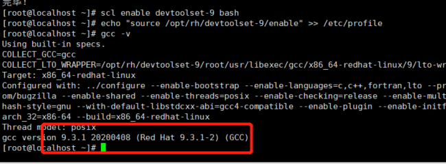 $ yum -y install centos-release-scl $ yum -y install devtoolset-9-gcc devtoolset-9-gcc-c++ devtoolset-9-binutils $ scl enable devtoolset-9 bash $ echo "source /opt/rh/devtoolset-9/enable" >> /etc/profile $ gcc -v