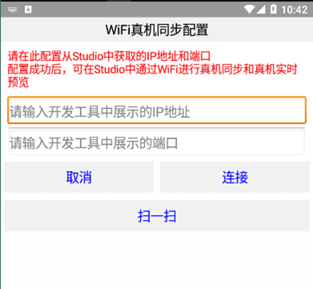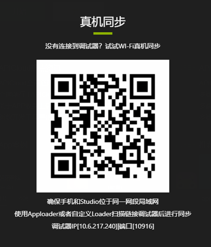 点击后会出现真机同步的界面,不需要扫码,我们只需要把最下方的调试器IP和端口输入到刚才模拟器的同步配置界面中,然后点击连接就可以成功连接了。如果不用模拟器,想要用手机展示效果的话,需要确保手机和Studio在同一网络下。
