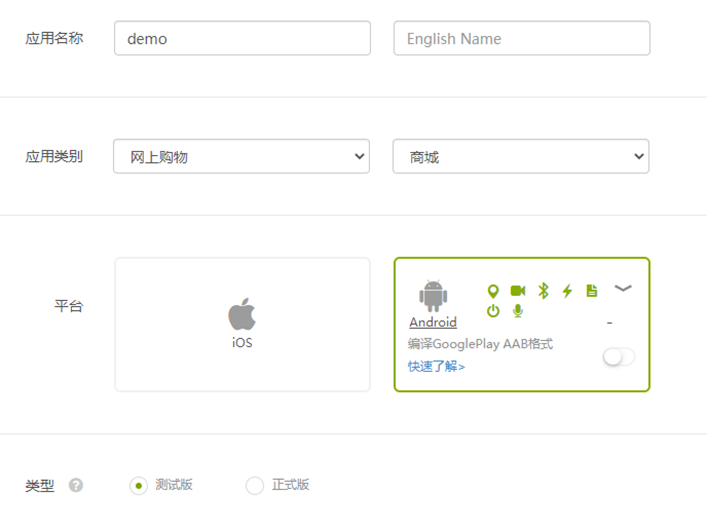 代码上传完成之后我们需要进行云编译,点击控制台左侧导航栏的云编译。云编译时可以给我们的app起一个吸引人的名字,然后选择一下应用类别(如网上购物-商城)和应用平台(iOS或Android), 编译类型可以选择正式版或者测试版,其他设置如全局加密和SVN设置暂且禁用,我们这里选择一下测试版,之后就可以进行编译了。