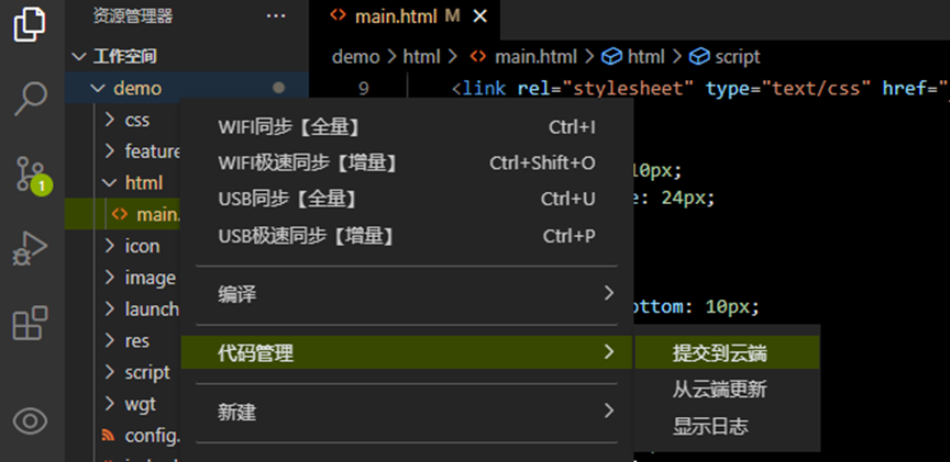现在我们就可以进行开发了,我们需要用到前端开发技术,零基础的开发者们可以先简单学习一下HTML、CSS、JS的基础。然后我们在主页中写入一个按钮,设置点击事件,想要在点击按钮后弹出提示。写完后记得保存,然后再鼠标右键点击项目名demo,再次进行WIFI同步。