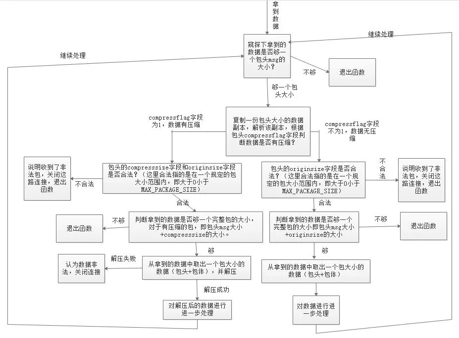 这段代码先根据包头的压缩标志字段判断包体是否有压缩,如果有压缩,则取出包体大小去解压,解压后的数据才是真正的业务数据。整个程序执行流程图如下: