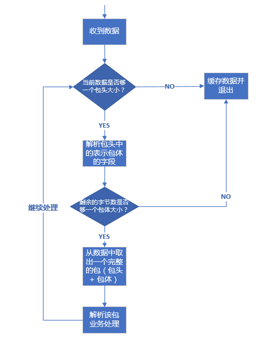 在理解了前面介绍的数据包的三种格式后,我们来介绍一下针对上述三种格式的数据包技术上应该如何处理。其处理流程都是一样的,这里我们以包头 + 包体 这种格式的数据包来说明。处理流程如下: