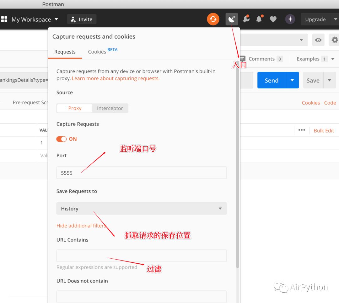 另外,Postman 中的拦截器,即:Interceptor,根据过滤条件,拦截 PC 端对应的网络请求,保存到左侧的请求历史记录中或请求集合下。