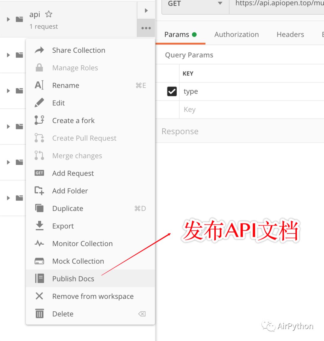 然后选中这个请求集合,点击 Publish Docs,跳转到集合发布页面,执行发布操作。