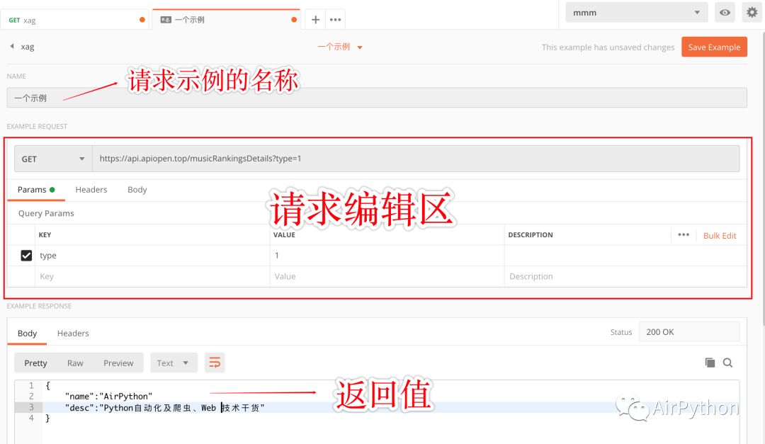 接着,为每一条网络请求新增一个示例 Example,加入 URL、请求头、请求参数及预设的返回值。