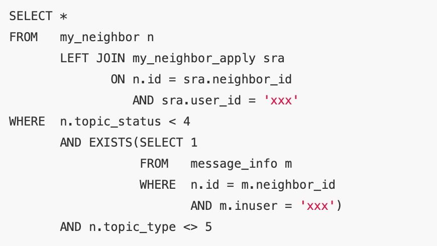 去掉 exists 更改为 join,能够避免嵌套子查询,将执行时间从1.93秒降低为1毫秒。