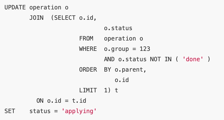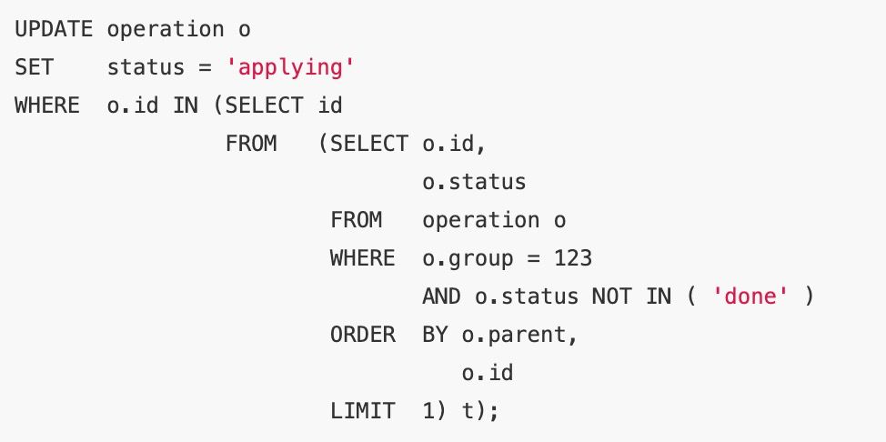 虽然 MySQL5.6 引入了物化特性,但需要特别注意它目前仅仅针对查询语句的优化。对于更新或删除需要手工重写成 JOIN。比如下面 UPDATE 语句,MySQL 实际执行的是循环/嵌套子查询(DEPENDENT SUBQUERY),其执行时间可想而知。执行计划:
