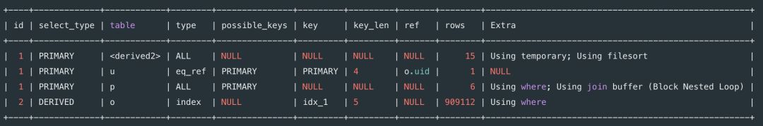再检查执行计划:子查询物化后(select_type=DERIVED)参与 JOIN。虽然估算行扫描仍然为90万,但是利用了索引以及 LIMIT 子句后,实际执行时间变得很小。