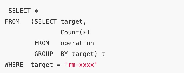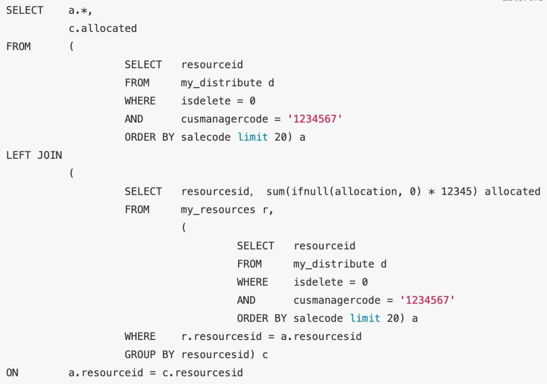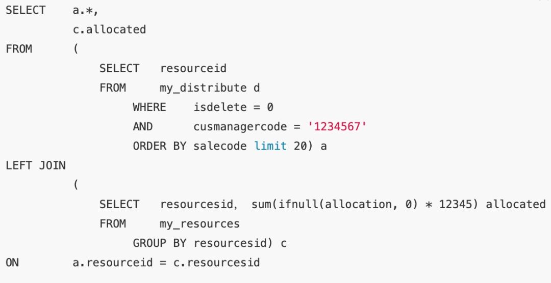 再来看下面这个已经初步优化过的例子(左连接中的主表优先作用查询条件):那么该语句还存在其它问题吗?不难看出子查询 c 是全表聚合查询,在表数量特别大的情况下会导致整个语句的性能下降。其实对于子查询 c,左连接最后结果集只关心能和主表 resourceid 能匹配的数据。因此我们可以重写语句如下,执行时间从原来的2秒下降到2毫秒。