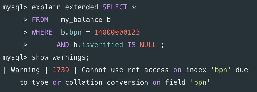 SQL语句中查询变量和字段定义类型不匹配是另一个常见的错误。比如下面的语句:其中字段 bpn 的定义为 varchar(20),MySQL 的策略是将字符串转换为数字之后再比较。函数作用于表字段,索引失效。上述情况可能是应用程序框架自动填入的参数,而不是程序员的原意。现在应用框架很多很繁杂,使用方便的同时也小心它可能给自己挖坑。