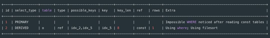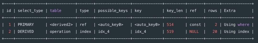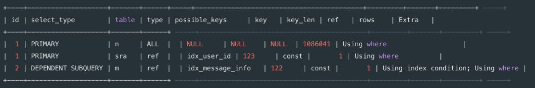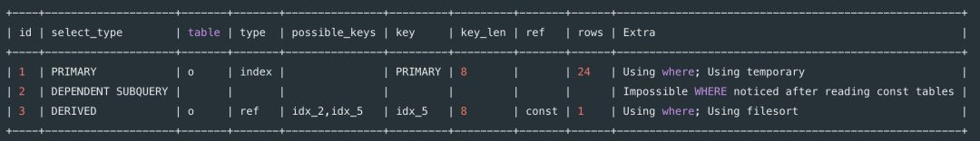重写为 JOIN 之后,子查询的选择模式从 DEPENDENT SUBQUERY 变成 DERIVED,执行速度大大加快,从7秒降低到2毫秒