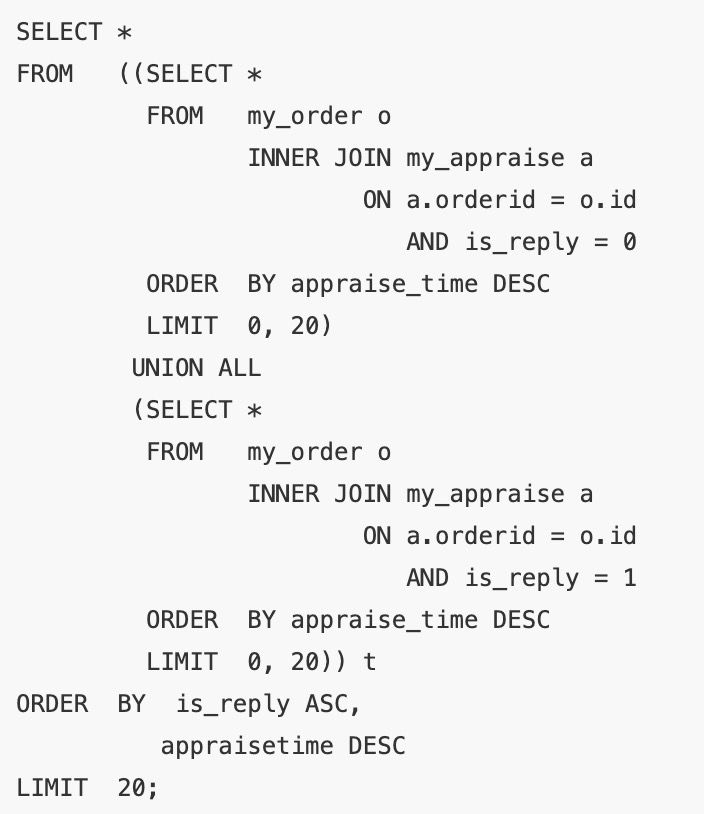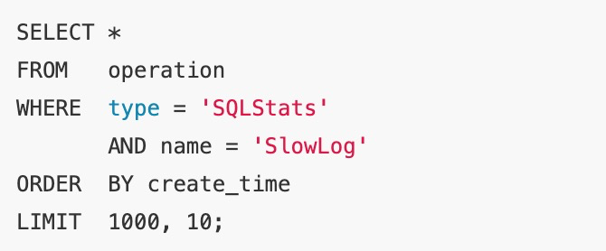 分页查询是最常用的场景之一,但也通常也是最容易出问题的地方。比如对于下面简单的语句,一般 DBA 想到的办法是在 type, name, create_time 字段上加组合索引。这样条件排序都能有效的利用到索引,性能迅速提升。好吧,可能90%以上的 DBA 解决该问题就到此为止。但当 LIMIT 子句变成 “LIMIT 1000000,10” 时,程序员仍然会抱怨:我只取10条记录为什么还是慢?要知道数据库也并不知道第1000000条记录从什么地方开始,即使有索引也需要从头计算一次。出现这种性能问题,多数情形下是程序员偷懒了。在前端数据浏览翻页,或者大数据分批导出等场景下,是可以将上一页的最大值当成参数作为查询条件的。SQL 重新设计如下: