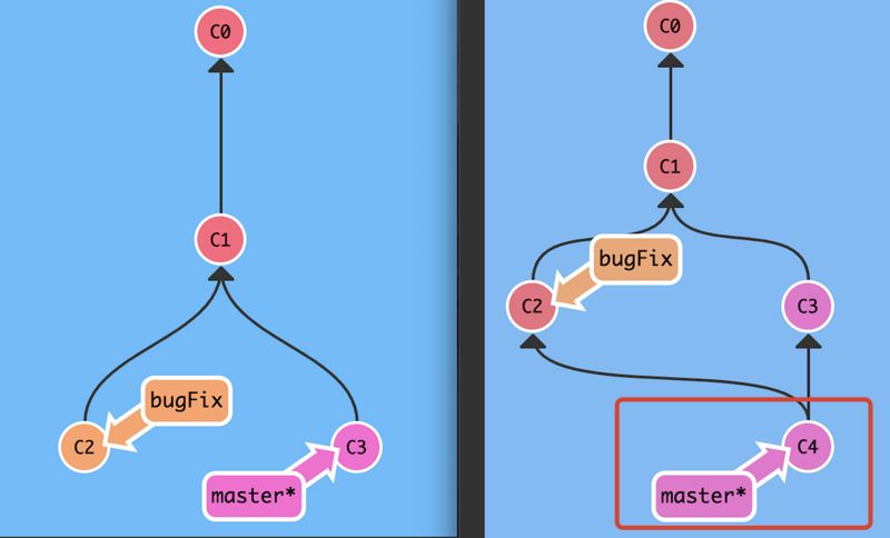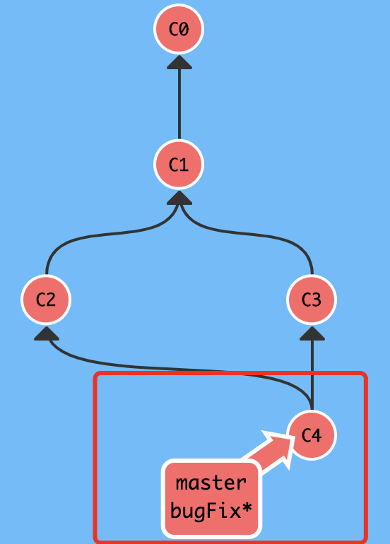 可以看出来,红色圈圈是最主要的改变—— merge 合并分支后,会在 master 分支上 新增一个 C4 提交 ,而 C4 提交里面有 master 和 bugFix 代码库所有的修改。