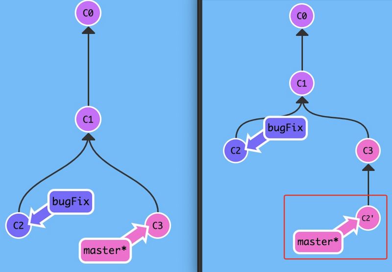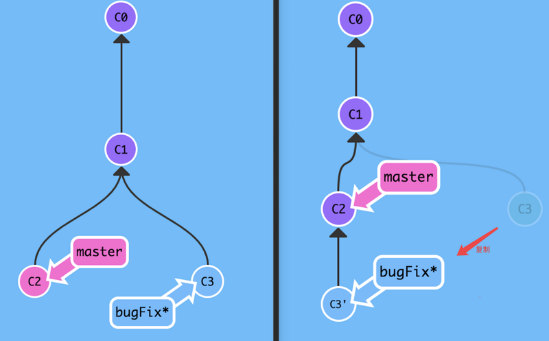 bugFix 分支里的内容通过 rebase 直接 复制 到 master 分支上。现在 bugFix 分支上的工作在 master 的最顶端,同时我们也得到了一个更 线性 的提交序列。