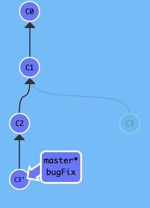 但是,此时 master 还没有和 bugFix 同步(颜色不同),我们还需要执行如下代码:
