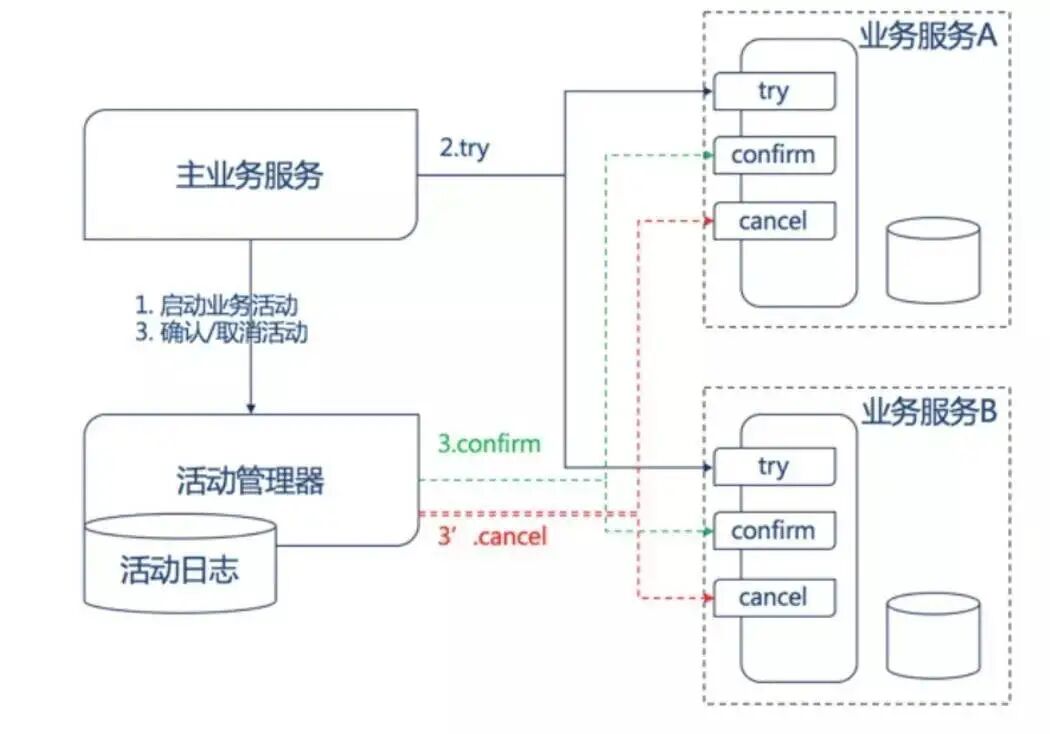 如果Try在所有服务中都成功,那么执行Confirm操作,Confirm操作不做任何的业务检查(因为try中已经做过),只是用Try阶段预留的业务资源进行业务处理;否则进行Cancel操作,Cancel操作释放Try阶段预留的业务资源。