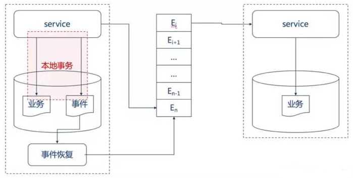 业务服务在提交前,向事件服务发送事件,事件服务只记录事件,并不发送。业务服务在提交或回滚后通知事件服务,事件服务发送事件或者删除事件。不用担心业务系统在提交或者会滚后宕机而无法发送确认事件给事件服务,因为事件服务会定时获取所有仍未发送的事件并且向业务系统查询,根据业务系统的返回来决定发送或者删除该事件。