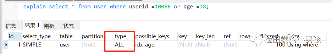 explain select * from user where userid =10086 or age =18;