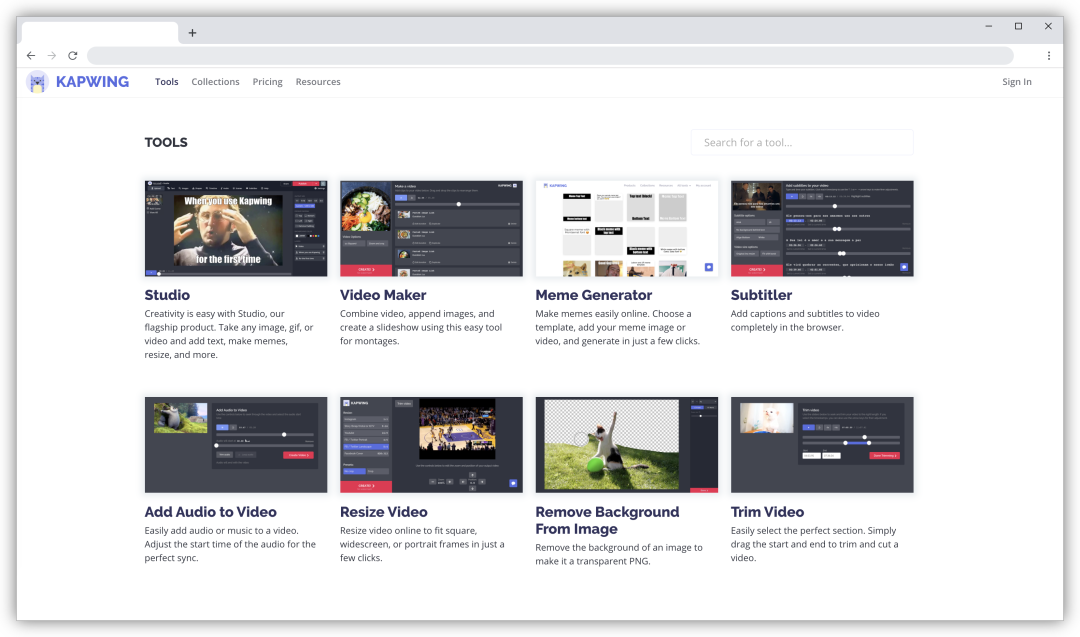 Kapwing 是一个在线视频编辑网站,集成了很多在线小工具,当有视频编辑的需求手头却没有什么趁手的小工具的话,不妨用来应应急。网站并没有复杂的操作界面,已经把常见的需求做成了单独的小功能,即使没有视频编辑经验的小白,也能三秒上手。