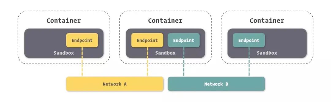 - Endpoint,就是虚拟网络的接口,就像普通网络接口一样,Endpoint 的主要职责是负责创建连接。在 CNM 中,终端负责将沙盒连接到网络。个人理解:Endpoint 与常见的网络适配器类似,也就意味着 Endpoint 只能接入某一个网络。因此,如果容器需要接入到多个网络,就需要多个 Endpoint。