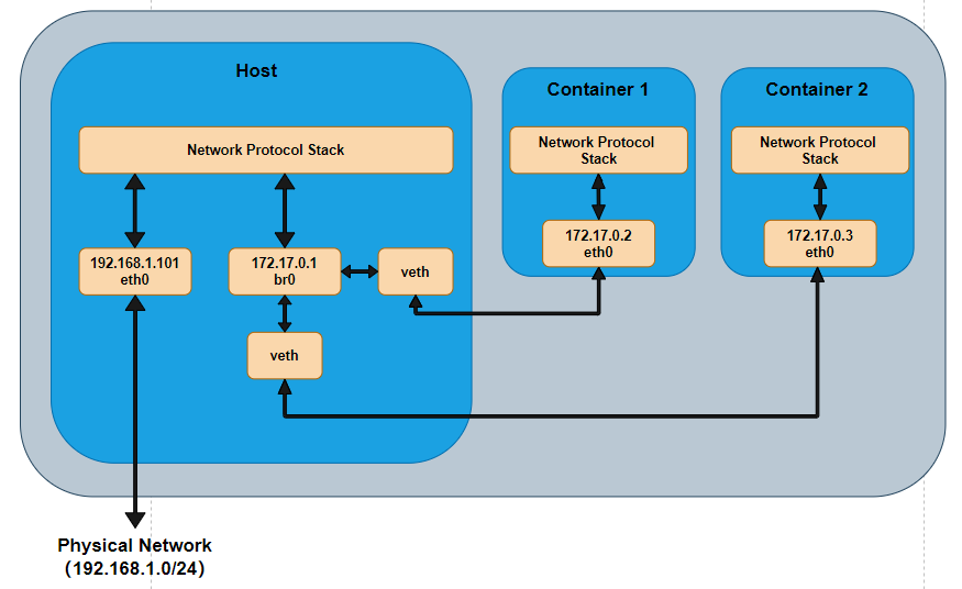 那么,容器在没有指定要加入的网络情况下,都是加入这个网络的,假如之后的拓扑图跟前面的一样。另外,单机桥接网络中的容器想要对外发布服务的话,需要依赖于端口映射,这也是为啥我们在启动容器的时候需要指定端口映射关系 的原因。