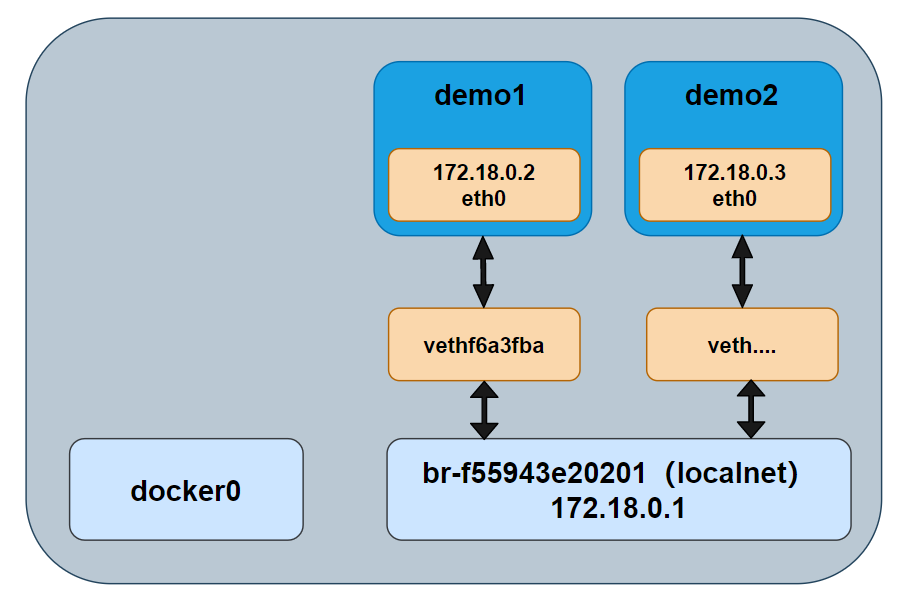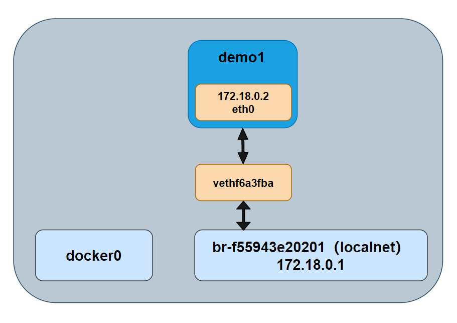 之外,我们可以看到 demo1 的 IP 地址是 172.18.0.2,这个与网桥 br-f55943e20201 是处于同一个网段内的。