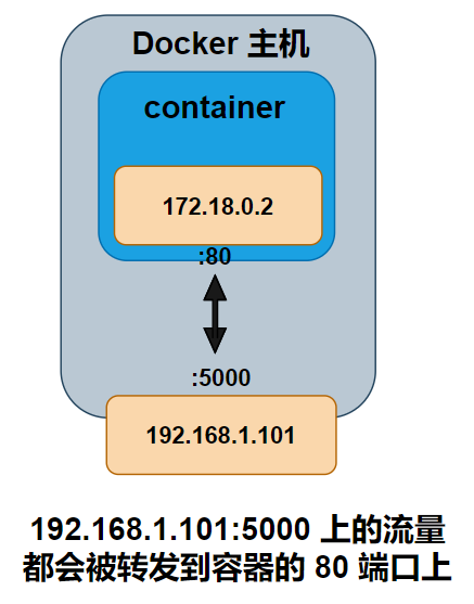 如下图所示,假设我们运行了一个新的 web 服务容器,并且将容器 80 端口映射到 Dokcer 主机的 5000 端口。